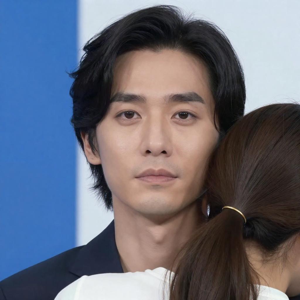 Photograph of two men on an outdoor stage at dusk. Foreground: young man with short brown hair, black suit, white shirt, holding microphone, intense gaze. Background: older man with black hat, white shirt, red vest, neutral expression. Blue sky, mountains. Red boxes with gold details on stage.