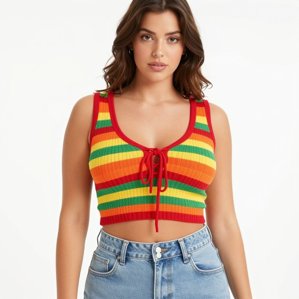 "Woman, playful retro, cropped knit tank top in bold horizontal stripes of red, orange, green, and yellow, scoop neckline with red trim, lace-up front detail, high-waist light wash denim jeans with button fly, minimal makeup, natural wavy hair, white studio background.. Sexy. Pretty face and beаutiful eyes. Big breasts."