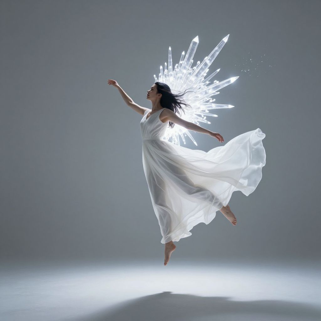 A woman in a flowing white gown defies gravity, suspended mid-air as a radiant, ethereal halo of crystalline spikes emerges from her back, casting an otherworldly glow against the stark, minimalist room.
