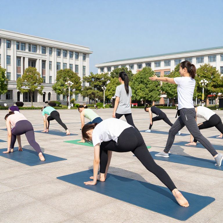 College girls in yoga pants attending an outdoor fitness class on the university quad, instructor demonstrating stretches, lively and motivating environment, well-lit scene with clear blue sky, various yoga poses depicted with attention to anatomy and clothing texture.