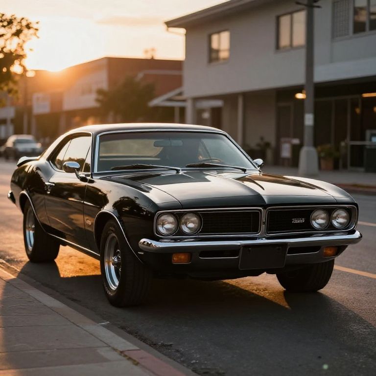 Black car pfp, vintage muscle car with shiny black paint, chrome details, bold front grille, parked on urban street at sunset, warm golden hour light casting long shadows, artistic style, high resolution