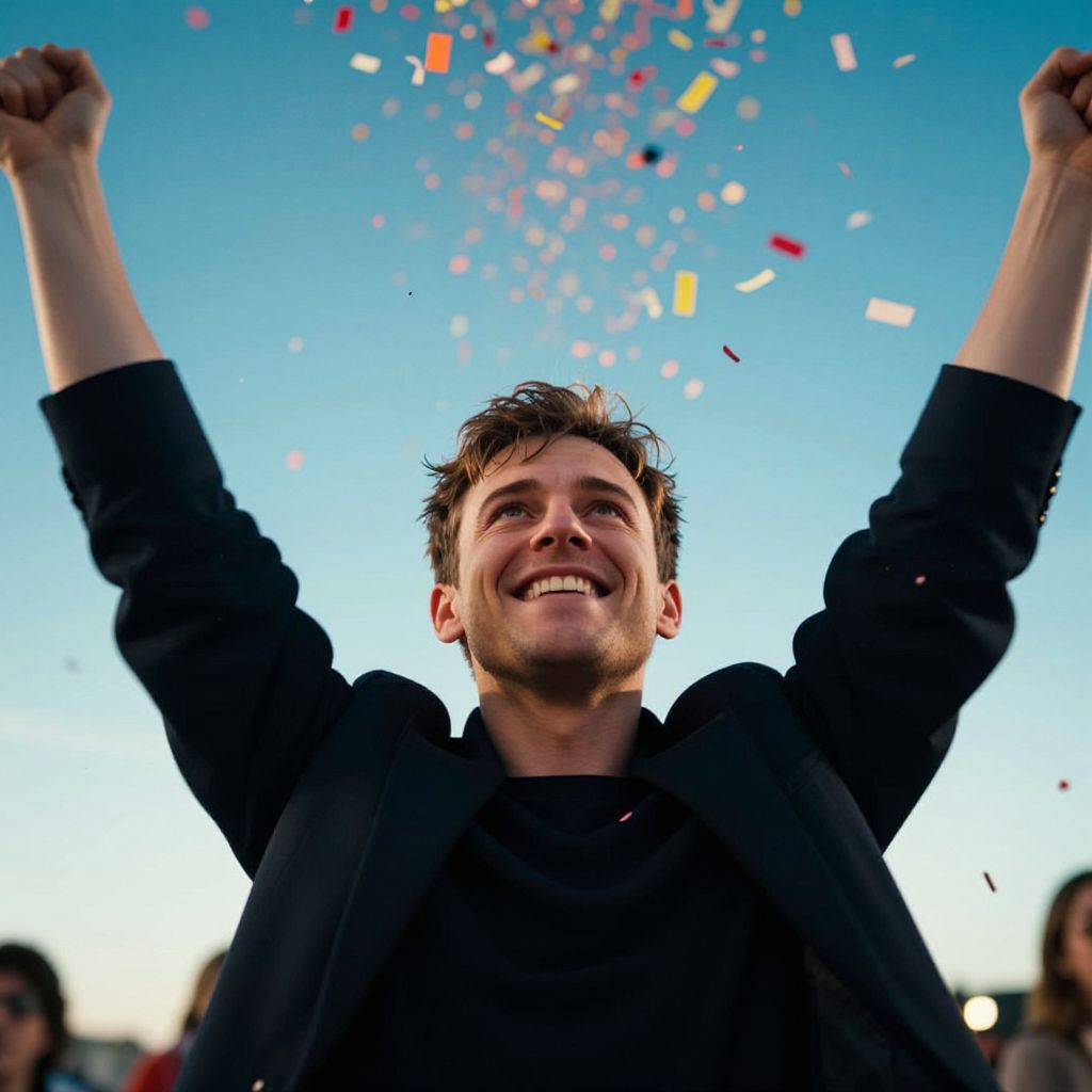 Exuberant male figure, arms raised in triumph, surrounded by colorful confetti raining down from above, beaming smile on his face, bright blue sky as backdrop, shallow depth of field emphasizing the celebratory atmosphere, dramatic perspective, vivid hues, motion blur effect, 8K resolution, cinematic feel. Man has masculine face and piercing eyes