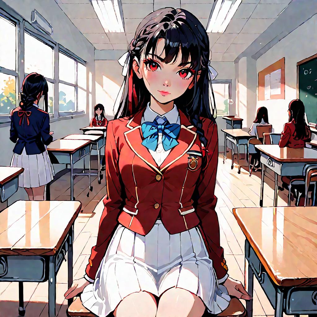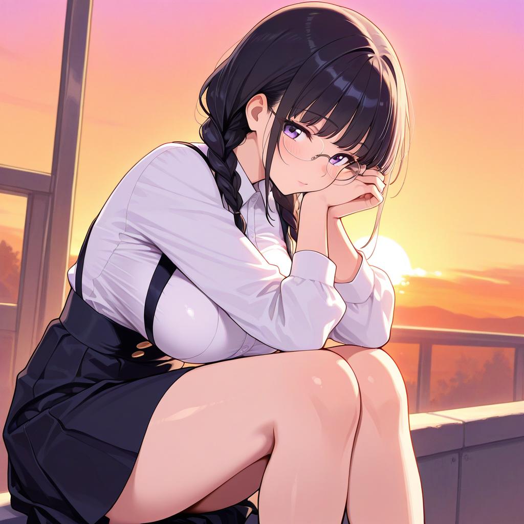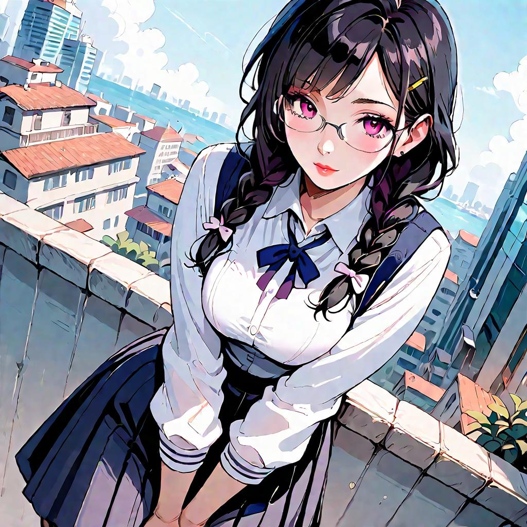 Score_9, score_8_up, score_7_up, source_anime, tsubasahanekawa, hanekawa tsubasa, long hair, black hair, hair ornament, purple eyes, braid, hairclip, twin braids, glasses, mature female, skirt, school uniform, naoetsu high school uniform, outdoors, cityscape, bent over, looking at viewer, cowboy shot, dutch angle