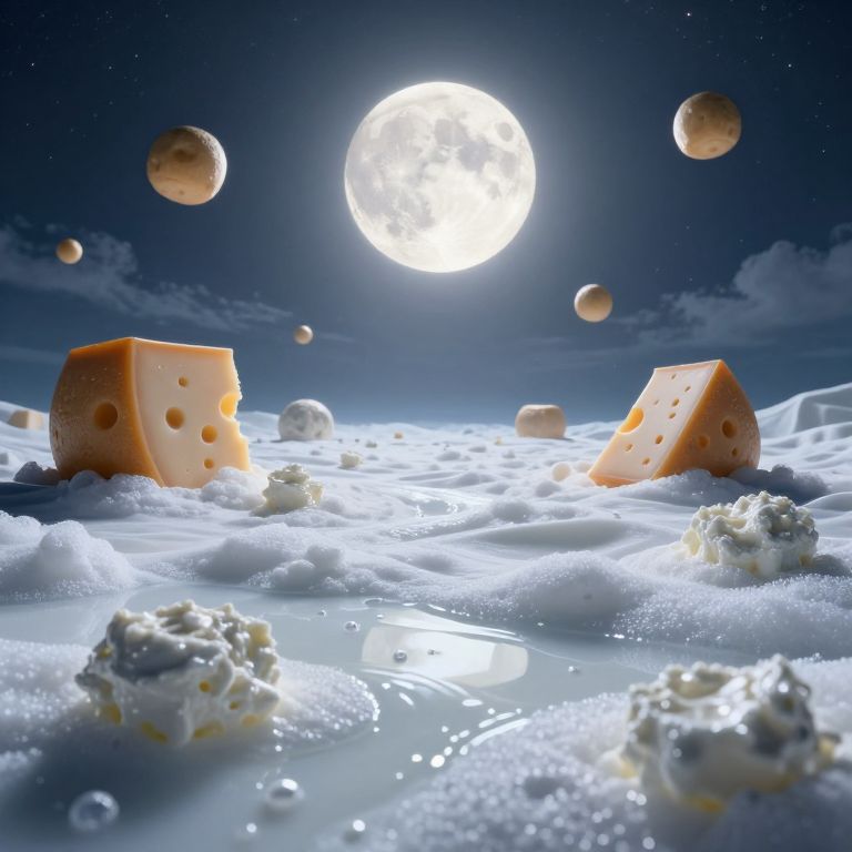 Create an image that embodies surreal artistry, portraying a dreamlike vista as seen through a kaleidoscope from above. In the foreground, enigmatic floating islands, crafted from various food items like bread slices and cheese, float mysteriously amidst an expansive sea of scarlet broth. An immense timepiece with tangled gears and floating pendulums casts elongated, eerie shadows upon this fantastical landscape below. The scene's vibrant colors and abstract shapes create a whimsically haunting atmosphere that invites viewers to explore the mind-bending world within this imaginative panorama.