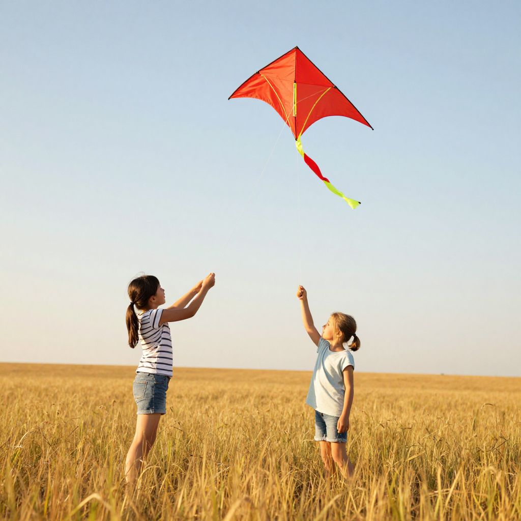 Two children stand in a field of golden grass, their hands guiding a vibrant red kite against a serene sky, evoking a sense of timeless wonder and anticipation as they playfully engage with the unseen forces of the future.
