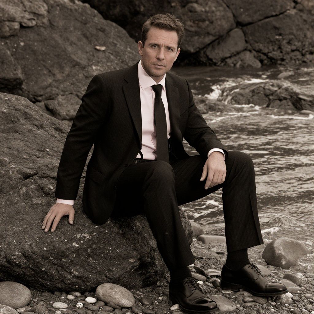 A man, black pinstripe suit, pale pink dress shirt, black suspenders, polished black derby shoes, solid black tie, secluded rocky inlet, sepia effect, contemplative expression, gentle waves lapping against smooth stones. Man has masculine face and piercing eyes