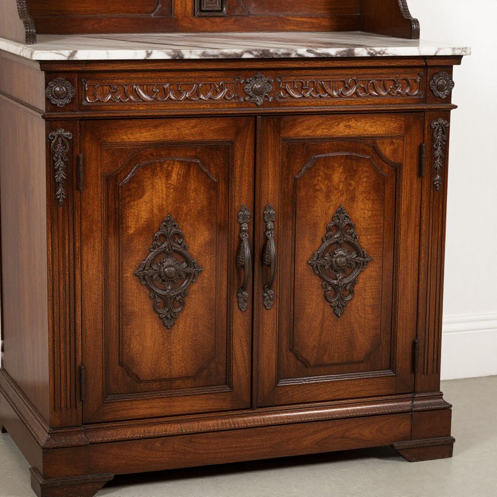 Elegant 20th-century Dutch Baroque-style cabinet featuring intricately carved dark wood details, arched panel doors with ornate handles, and a marble-topped surface, showcasing classic craftsmanship and refined design.