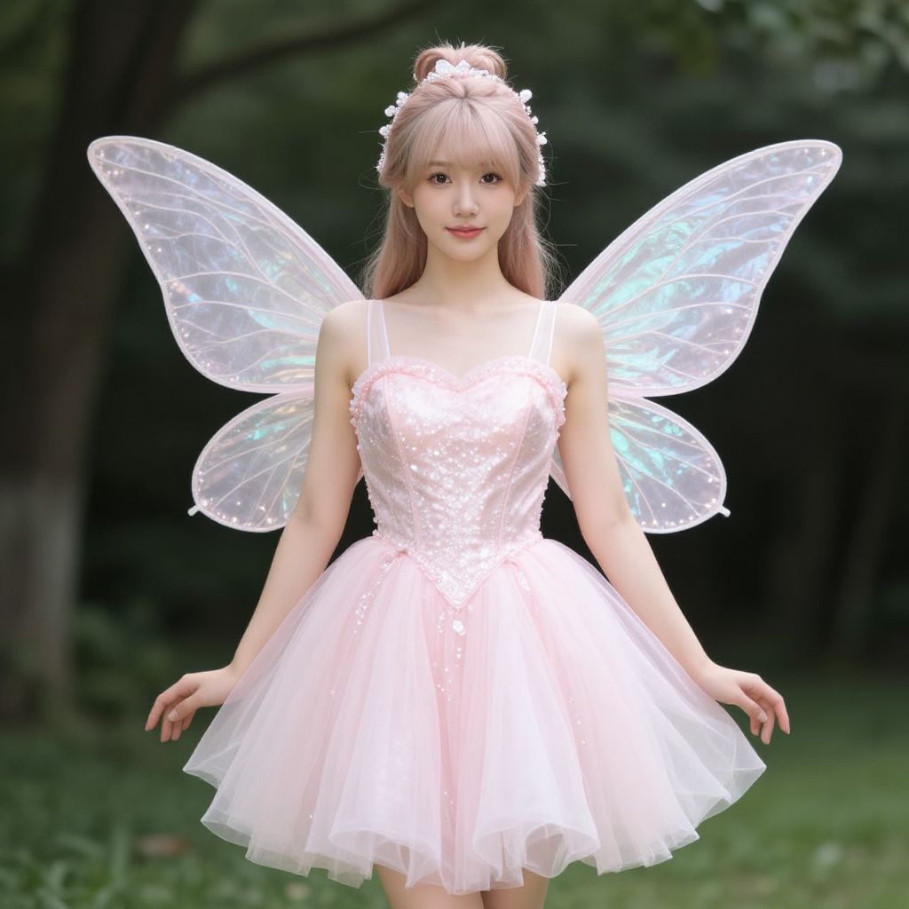 Photograph of an Asian woman with long, straight, blonde hair adorned with a floral headband. She wears a white, sleeveless, sparkling, tulle tutu dress and translucent, iridescent fairy wings. Her makeup is light with pink lipstick. She stands in a lush, green forest with blurred trees in the background. Her delicate, fair-skinned hands are gently extended to her sides. The image has a magical, ethereal quality with soft lighting highlighting her fairy-like appearance.