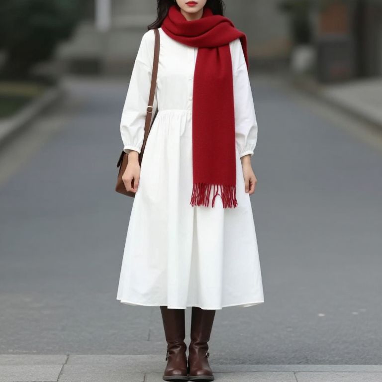 Photograph of a young Asian woman with white bob haircut, white hat, red jacket, white shirt, yellow skirt, white socks, brown loafers
