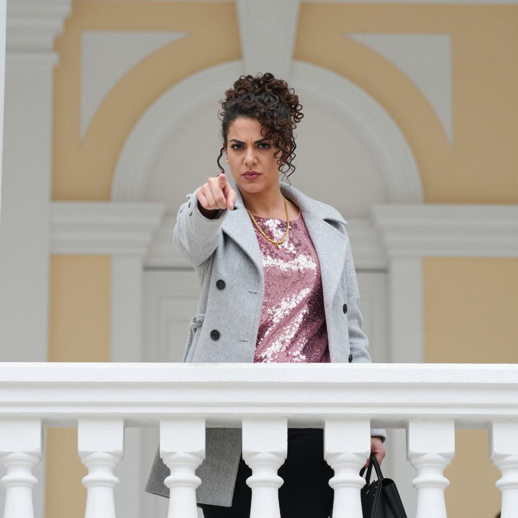 Woman with dark curly hair in an updo, wearing a pink sequined top, gray coat, and gold necklace, stands on a white balustrade. She points forward, intense expression. Ornate yellow and white wall background, large arch behind. One black handbag on her right. Indoor setting, daylight.