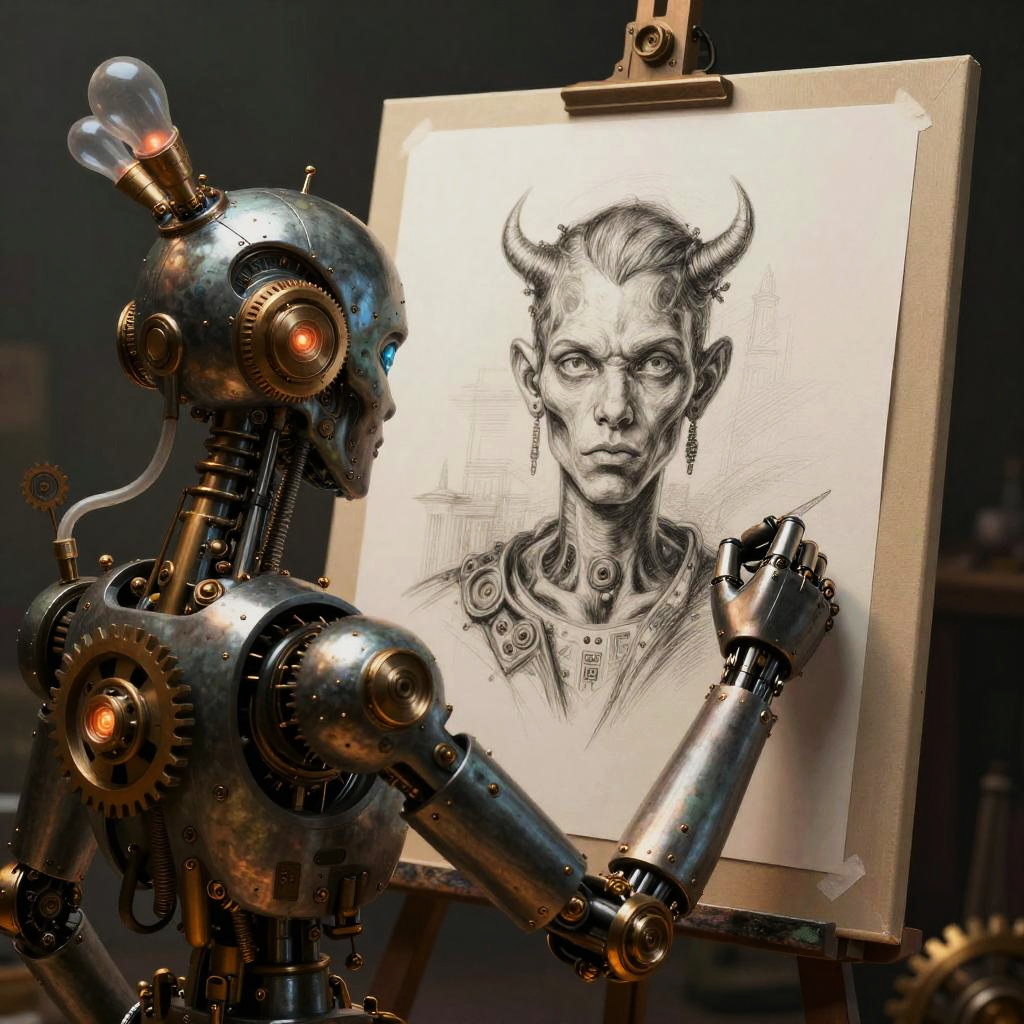 Photograph of a detailed, monochromatic pencil drawing on an easel, depicting a horned, serious-faced woman with pointed ears and glasses. A metallic, steampunk-style robot with glowing orange eyes and gears is positioned to the left, holding a pencil and appearing to sketch the portrait. The robot's shiny, silver surface contrasts with the textured, white paper. The background is dark and blurred, focusing attention on the drawing and robot. The scene combines elements of traditional art and futuristic technology.