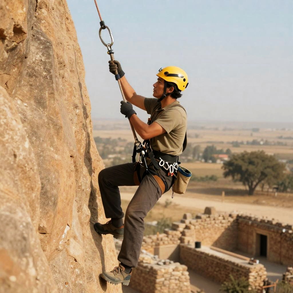 Realistic photo.Cinematic shot of a skilled archaeologist gripping a grappling hook tightly while scaling a ancient ruin during a high-stakes mission. realistic photo