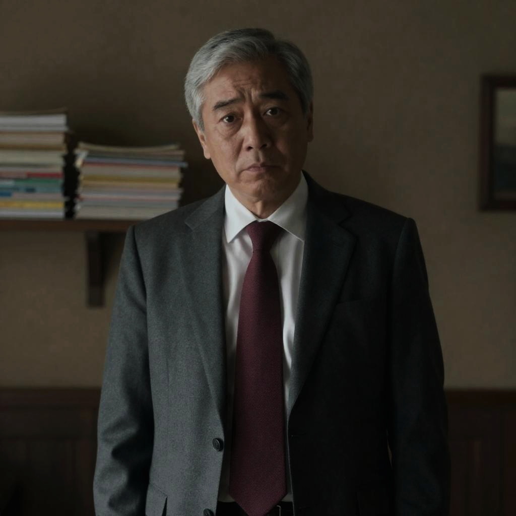 Middle-aged man in gray suit, white shirt, and maroon tie, with short, slicked-back gray hair, looking down with a serious expression. Wooden background. Photograph. Upper body, standing, slightly turned to the right. Natural lighting.