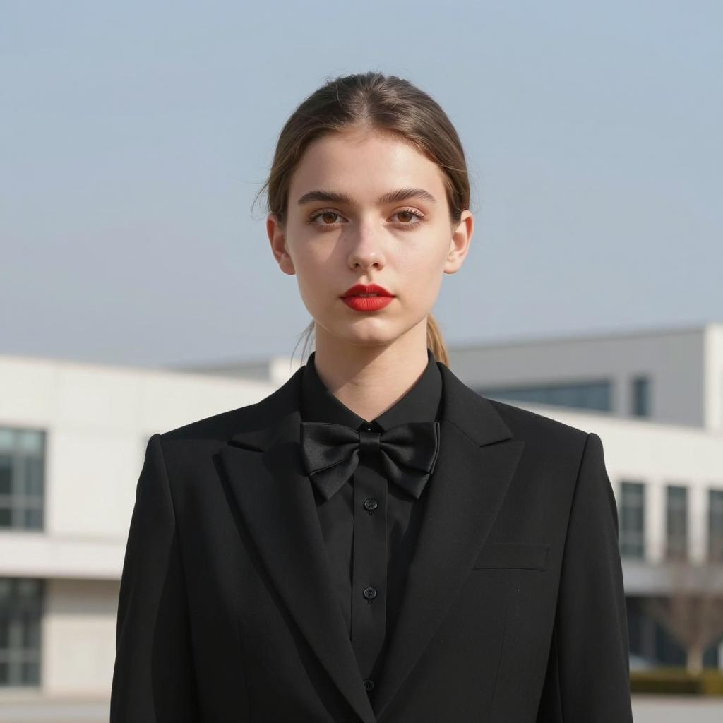 Smart formal wear woman, photograph of a young woman, centered, standing outdoors, daytime, clear sky, modern building in the background, brown hair in a low ponytail, brown eyes, light skin, wearing a black blazer with a bow tie, red lipstick, sharp eyebrows, professional look, slightly blurred background, bright natural light, realistic style, high-quality, detailed ures, focused on face and upper body
