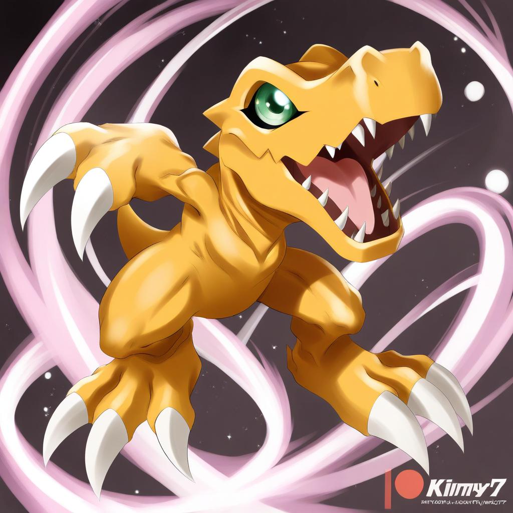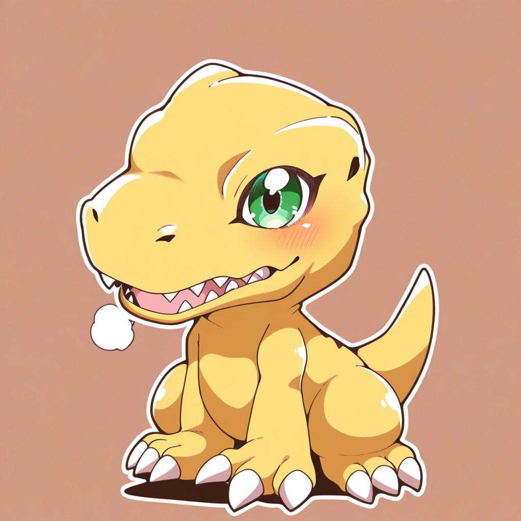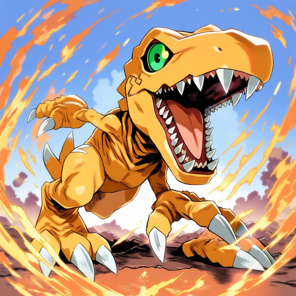Agumon, digimon, no humans, sharp teeth, green eyes, digimon (creature), claws, by artist jako (jakoo21), illustrious