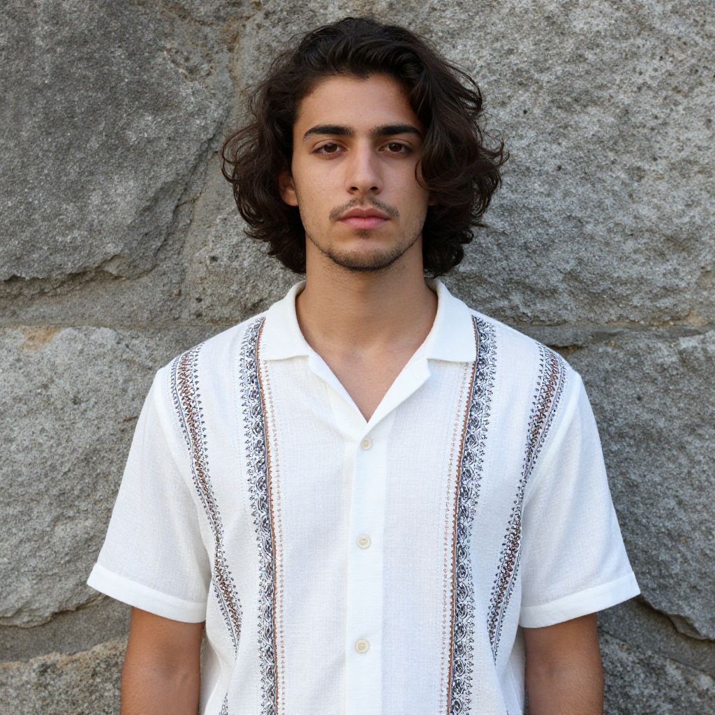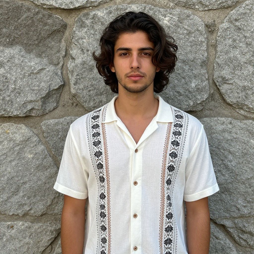 Photograph of a young man with medium-length, dark brown, wavy hair and a light stubble on his face. He's wearing a white, short-sleeved, button-up shirt with black and brown intricate patterns down the front and sleeves. He's standing against a rough, gray stone wall, looking directly at the camera with a neutral expression. The lighting is natural, highlighting his casual yet stylish look.
