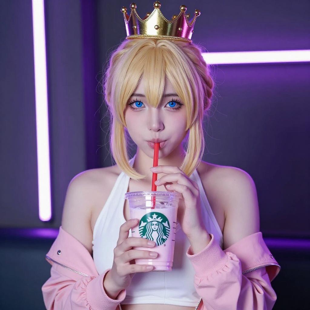 Photograph of a young woman with pale skin and blue eyes, cosplaying as a character with blonde hair, a gold crown, and a pink, off-shoulder, quilted jacket with black cross patterns. She bites a white string, looking directly at the camera with a playful expression. Soft purple and white lighting in the background.