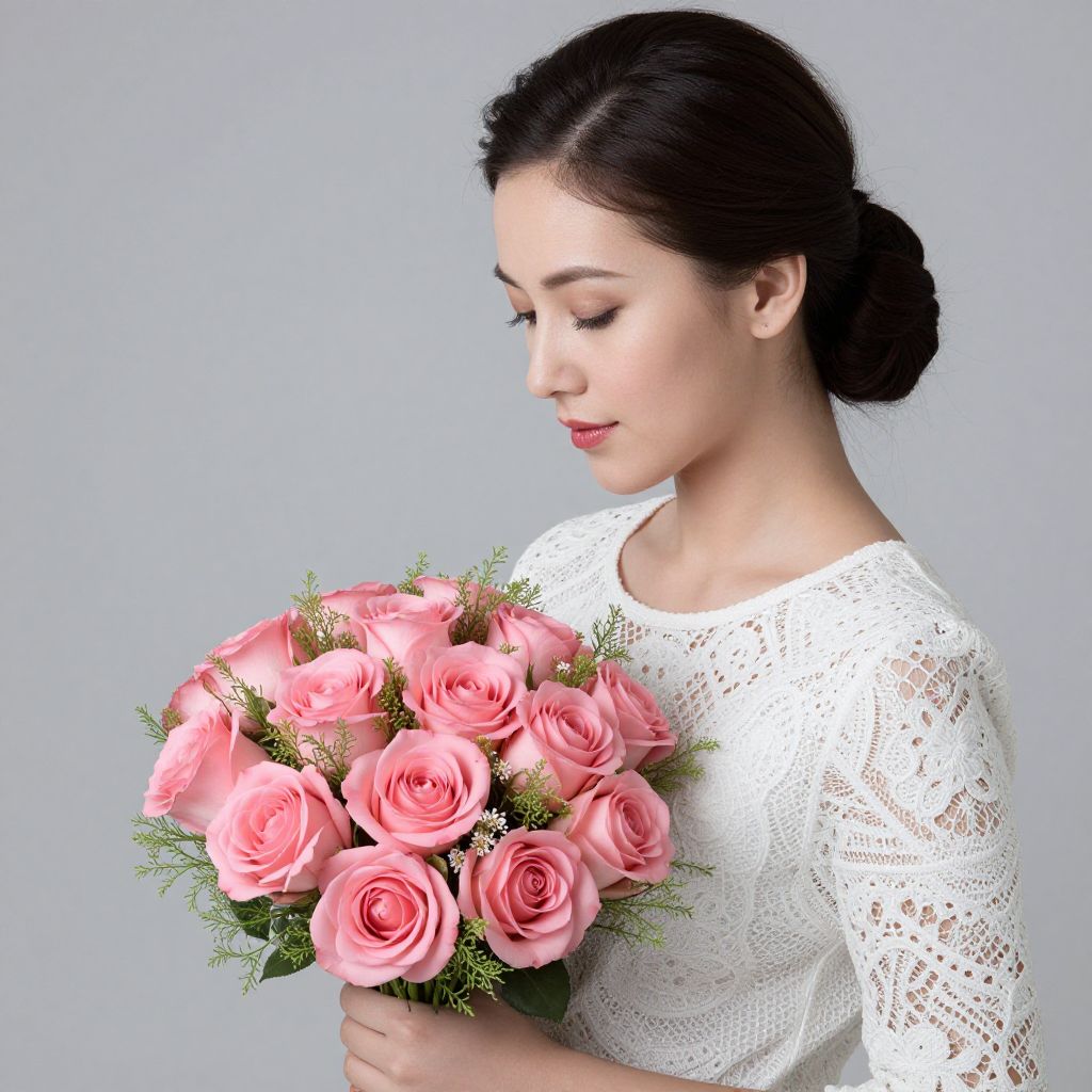 Elegant Woman with Pink Rose Bouquet