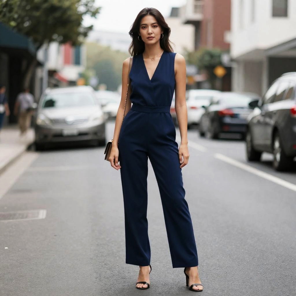 Navy Blue Jumpsuit, woman in a blue jumpsuit standing on a city street