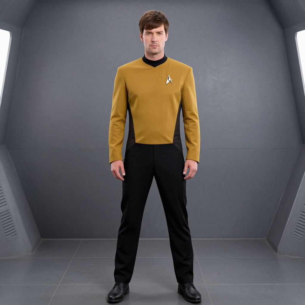 Photograph of a young Caucasian man with short brown hair, standing in a futuristic, gray-walled room. He wears a mustard-yellow, long-sleeved Starfleet uniform shirt with a black collar and black pants, featuring a small Starfleet insignia on the left chest. His black shoes are polished. He stands with a neutral expression, hands at his sides, centered in the frame. The background is minimalistic, with two bright, rectangular light sources on either side, enhancing the sci-fi setting. The lighting is even, highlighting the uniform's texture and color.