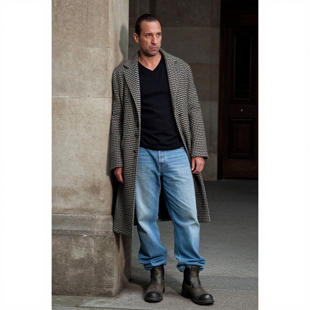 A man, long houndstooth coat, relaxed-fit blue jeans, black v-neck t-shirt, rugged ankle boots, imposing stone architecture, eastman film stock, contemplative expression Man has masculine face and piercing eyes