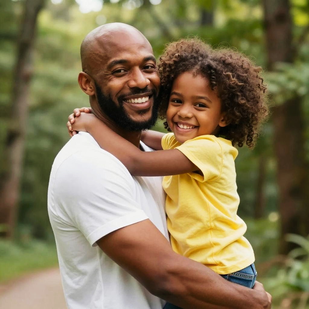 Photograph of a joyful African-American couple in a bright, sunny outdoor setting. The man, with a short beard and muscular build, wears a light gray t-shirt and lifts the young girl, who has a big, curly afro and wears a white shirt, onto his back. Both are smiling widely, arms raised playfully. The background is a blurred mix of green and yellow, suggesting trees and sunlight.