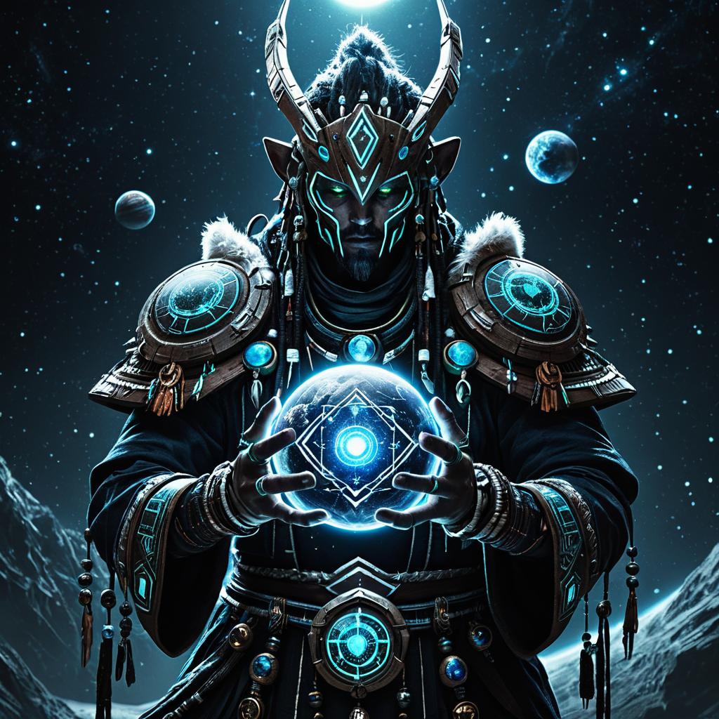 Cinematic shot of a giant robotic warrior holding a comet in space. Detailed with metallic armor, blue lights, inspired by mecha art and sci-fi fanart.