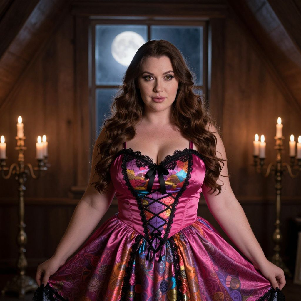 Photograph of a curvy woman with long, wavy brown hair standing in a dimly lit wooden room. She wears a vivid, pink, strapless corset dress with black lace trim and colorful, iridescent patterns, and a black crisscross bodice. She holds out the sides of her dress, revealing its full, voluminous skirt. Behind her, a window shows a bright full moon, and two lit candelabras flank her on either side, casting a warm glow. Her expression is confident, and she has a light skin tone. The room's wooden walls and the candelabras add a Gothic, romantic atmosphere to the image.