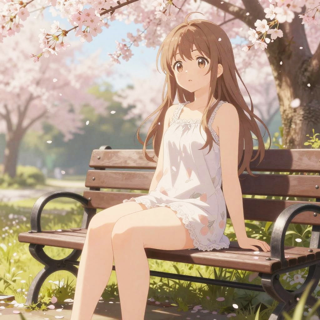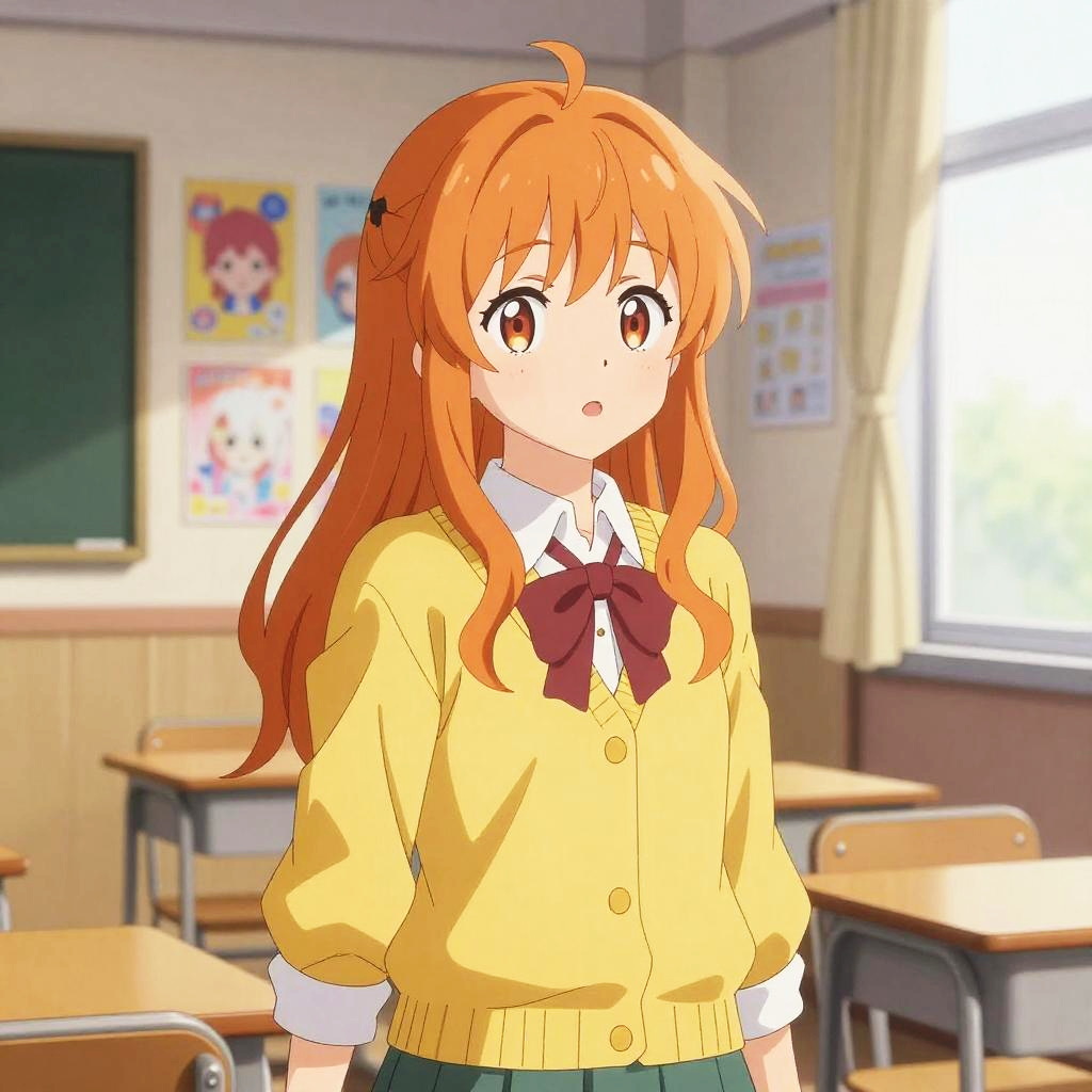 Ginger anime girl sitting on a rustic wooden bench in an autumn forest, surrounded by falling red and gold leaves, wearing a cozy sweater and scarf, warm and nostalgic atmosphere, soft shading, anime style with delicate linework.