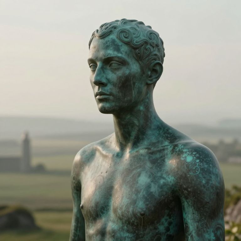 Photograph of a weathered bronze statue depicting a nude, androgynous figure with a serene expression, short wavy hair, and a muscular yet slender build. The statue's patina exhibits green and blue hues with areas of oxidation. The background is a blurred, expansive outdoor landscape featuring a grassy field and distant structures, including a tall, indistinct tower. The lighting is soft, suggesting either early morning or late afternoon. The statue is centrally positioned, with the background slightly out of focus, emphasizing the detailed texture and form of the statue.