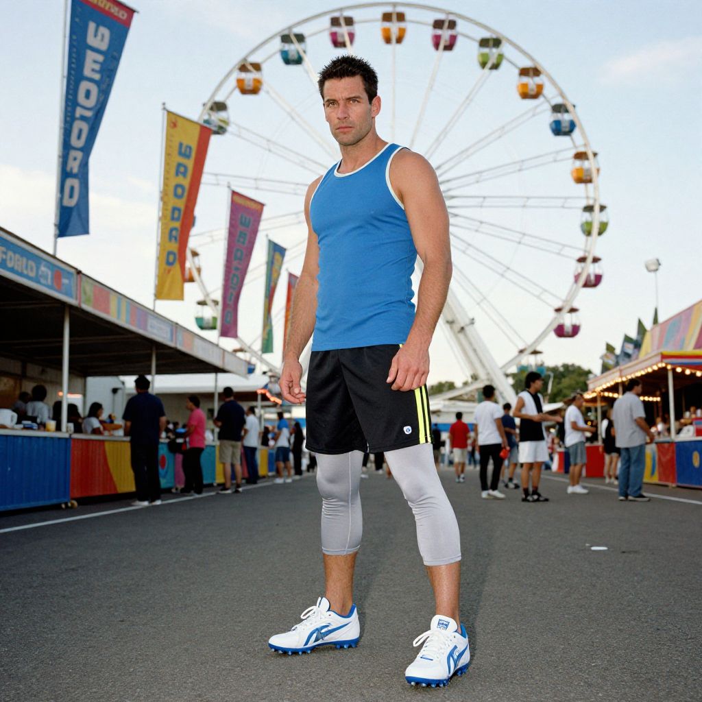 A man, sleeveless electric blue tank top, stretch-fit black shorts with neon yellow stripes, white lacrosse cleats with blue accents, moisture-wicking light gray base layer, standing by a ferris wheel, vibrant banners fluttering, game booths lined up, Ilford film stock style, focused expression, ready for action. Man has masculine face and piercing eyes