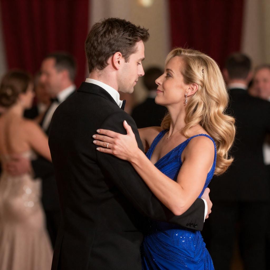 Photograph of three people dancing in a dimly lit room. A blonde woman in a blue patterned dress faces a dark-haired man in a gray suit, who holds her hands. A brunette woman in a black sleeveless dress stands to the right, watching them. The background is dark with blurred lights and framed pictures.
