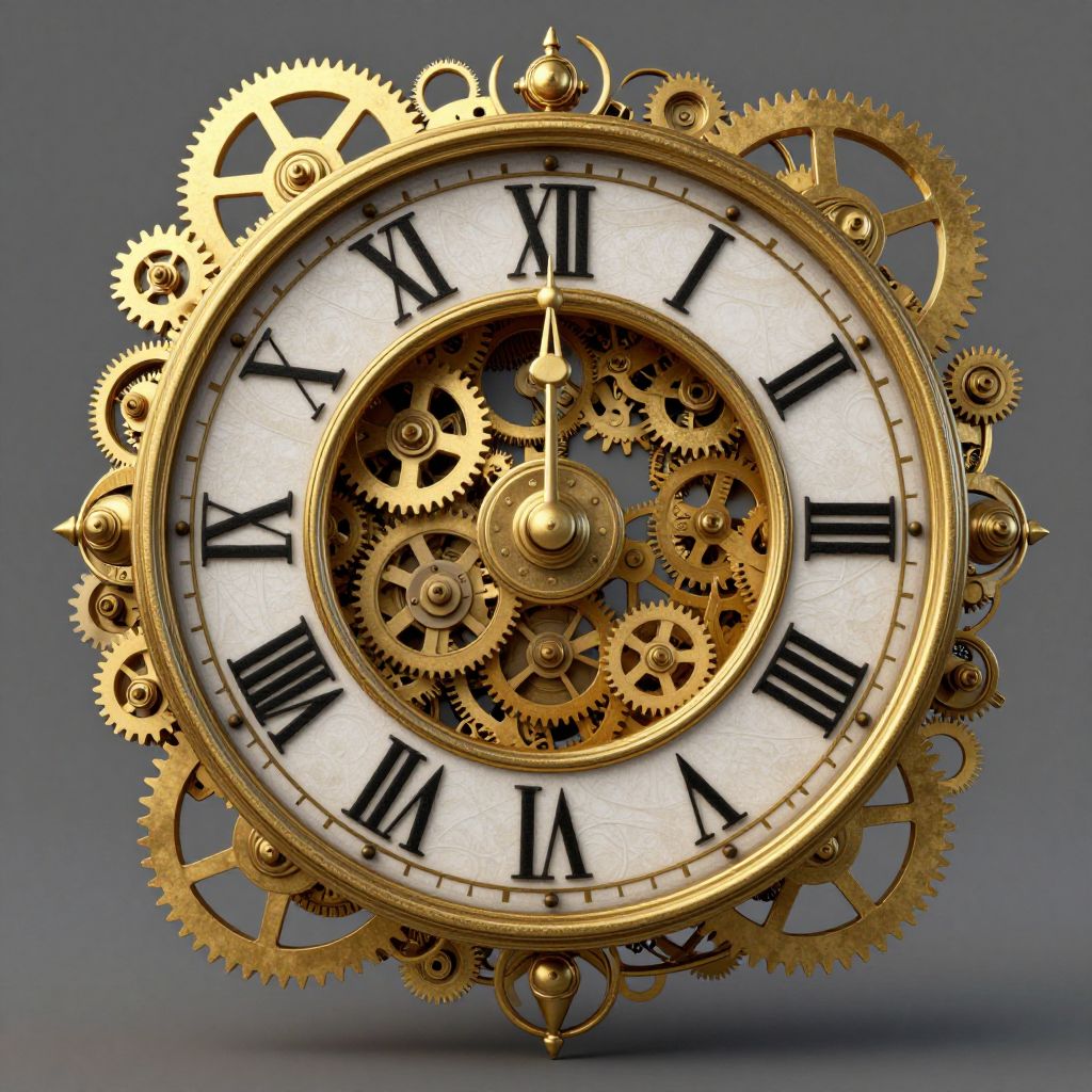 A steampunk-inspired 3D render of a vintage clock encased in intricate golden gears and cogs, featuring Roman numerals and a recursive fractal design that evokes a sense of time bending and looping backwards as it interacts with its surroundings.