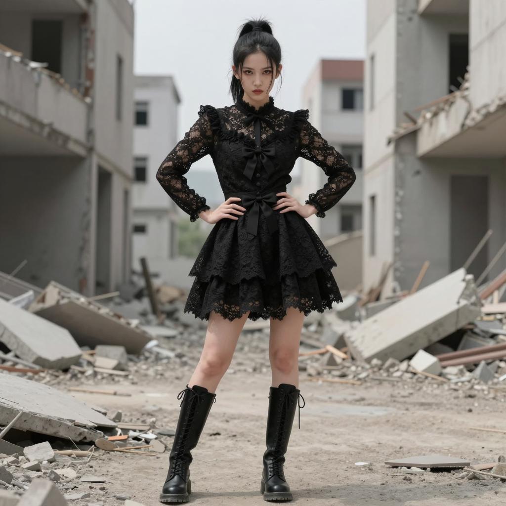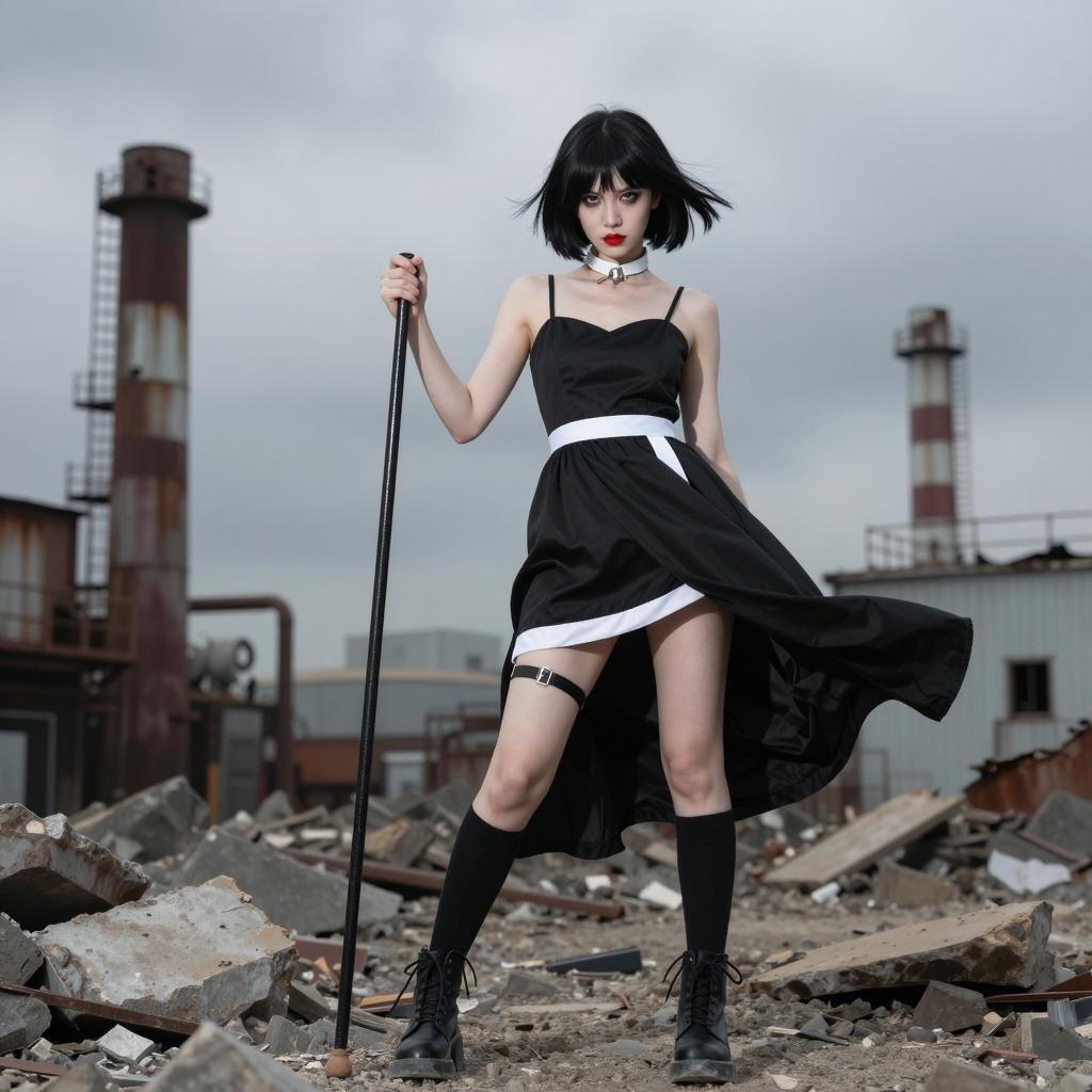 Goth girl with pale skin, black long hair, and red lipstick stands in ruins. She wears a black and red tulle dress, black off-shoulder sleeves, belt with chain, black boots, and a black bow in her hair. Her hands cover her face. Background includes broken bricks, metal structures, and industrial elements. Overcast sky.