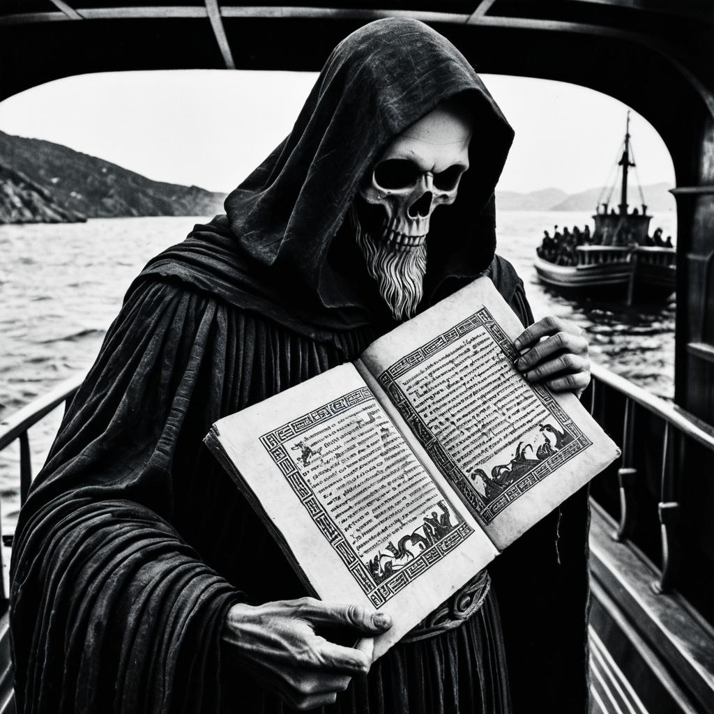 Grim Reaper Holding Glowing Cube on Misty Ferry