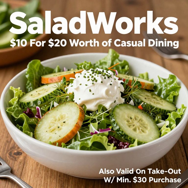 Photograph of a fresh salad with cucumber slices, lettuce, and dill, topped with cream, text overlay: "SaladWorks $10 for