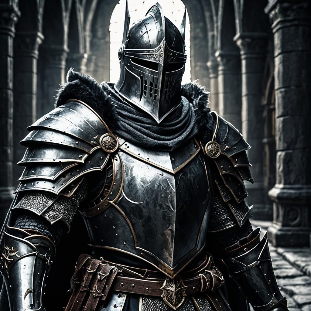 A photorealistic depiction of a knight clad in dark, intricately detailed medieval armor with fur accents, standing in a gothic stone archway. The armor features layered metal plates with ornate engravings and a full helmet with a narrow visor. The scene combines elements of high fantasy and dark fantasy art styles, emphasizing sharp highlights and deep shadows for dramatic effect.