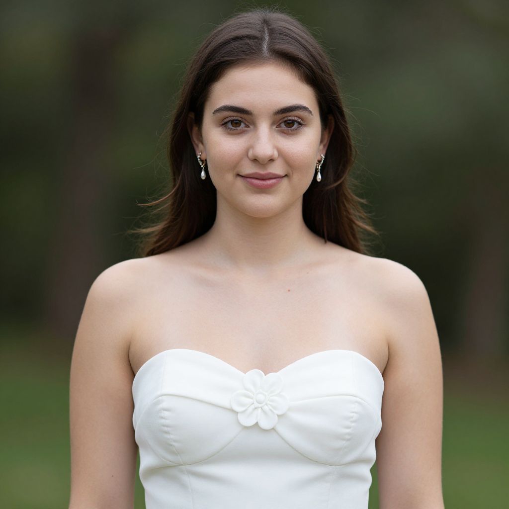 Prom dress flat chest, 1girl, solo, dress, brown hair, long hair, white dress, flower, looking at viewer, breasts, strapless, bare shoulders, realistic, jewelry, earrings, brown eyes, strapless dress, blurry, smile