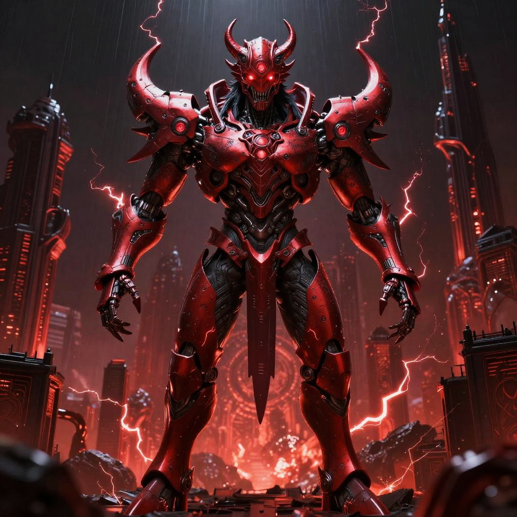 Powerfull (demonic creature:1.2), red tech googles, demon mask, androgynous male, strong pose, tech heavy armor, Raiden, metal gear style, lightning effects, thunder effects, dark sky raining, god of thunder, dark hair, infernal city background, tall structures, infernal towers background, dark red colors, apocalyptical, far distance, full body, perfect detailed face, detailed symmetric circular iris, realistic, stunning realistic photograph, 3d render, octane render, intricately detailed, cinematic, Isometric, dark fantasy theme, mystical, Dark theme, underworld theme, deviant art masterpiece, white skin, crimson eyes, dark tattoos, colour grading, dark illustration, extreme quality, extremely detailed, ultra-detailed face, ultra hd 8k, dark lightning, concept art, hyperdetailed, intricately detailed gothic art, triadic colours, fantastical, intricate detail, splash screen, complementary colours, fantasy concept art, 8k resolution, soft lighting, film photography, film grain, hyperrealism, fluid photography, gothcore, rudolph belarski, close - up, carl holsoe