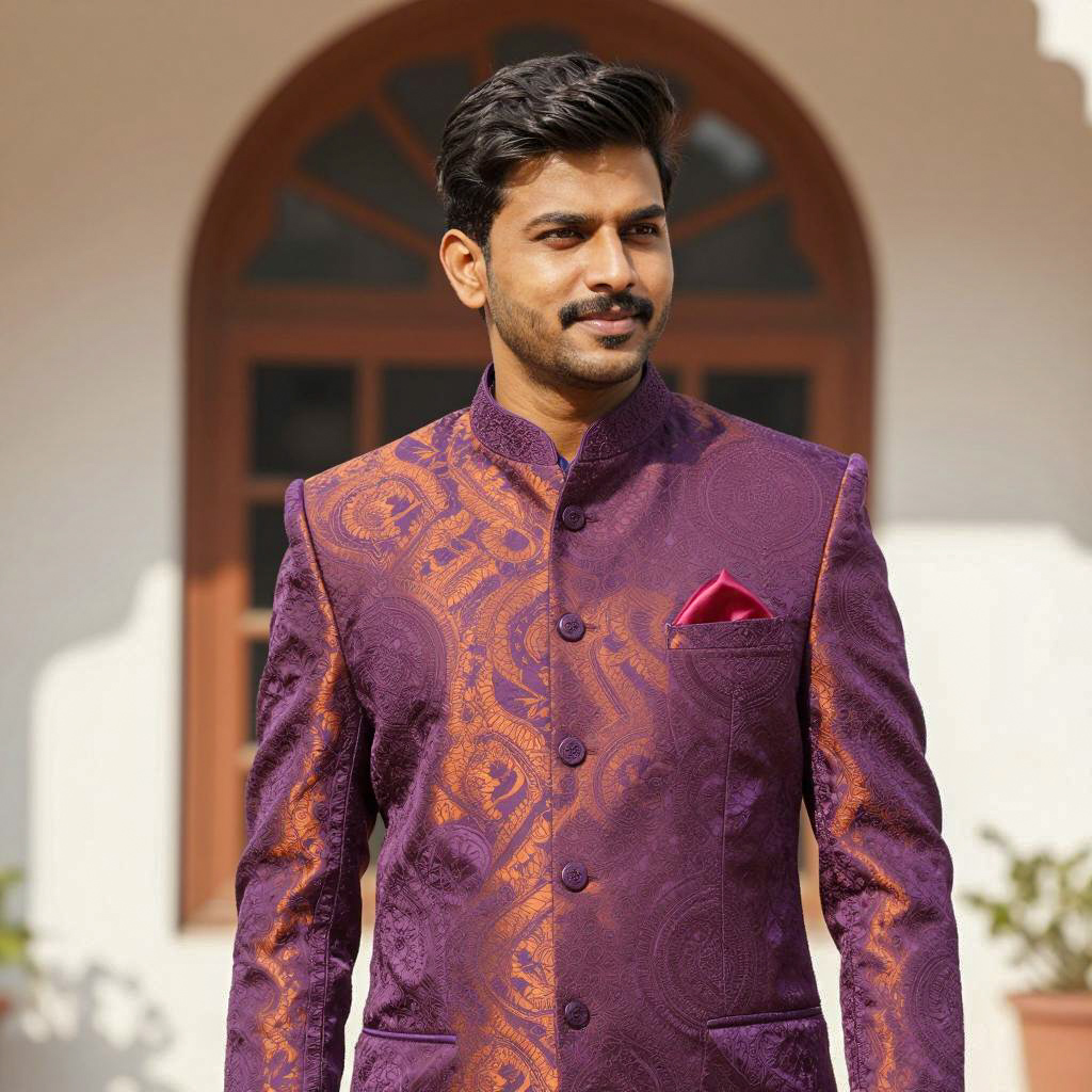 Portrait of a handsome Indian man with medium brown skin and dark hair, wearing a purple and orange patterned traditional bandhgala sherwani with a red pocket square. He stands outdoors in soft sunlight in front of a blurred arched window, sporting a well-groomed mustache and a slight smile. The image is captured in daytime with a realistic style and portrait orientation.