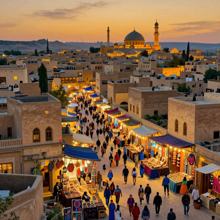 Photograph of a bustling evening bazaar in a historic Middle Eastern city, with illuminated stalls, crowd, sunset sky, and prominent dome-topped mosque