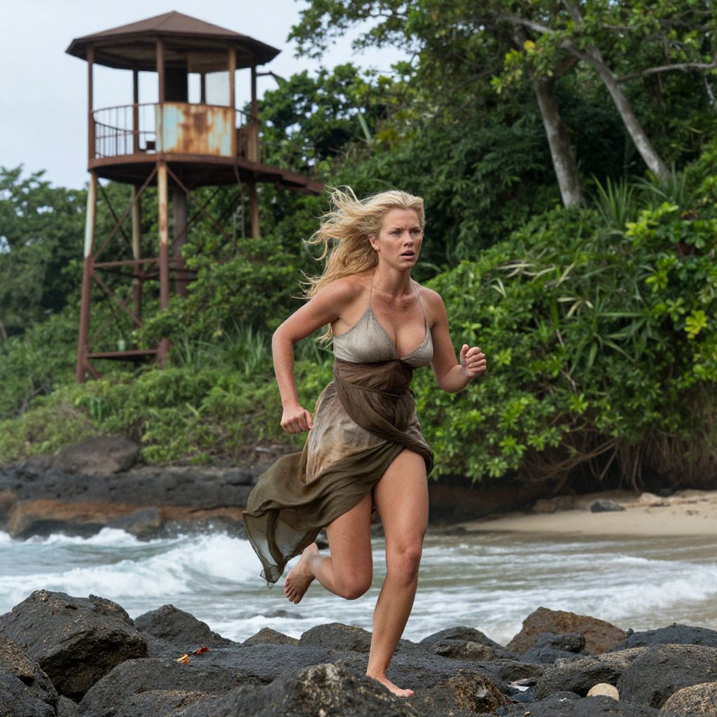 In this cinematic movie still, a beautiful blonde woman with long, flowing hair is captured in a dynamic running pose, her dress fluttering behind her as she sprints through a lush, tropical jungle. The woman's expression is one of intense focus and urgency, her face smeared with dirt, adding to the sense of danger and urgency. In the background, an old, rusted ranger tower stands tall, its weathered structure contrasting with the vibrant greenery of the surrounding foliage. The scene is set on a rugged, rocky beach, with the ocean's waves crashing in the distance, creating a sense of isolation and danger. The interplay of light and shadow, combined with the rich textures of the woman's dress and the dense jungle, creates a visually compelling and dramatic composition.