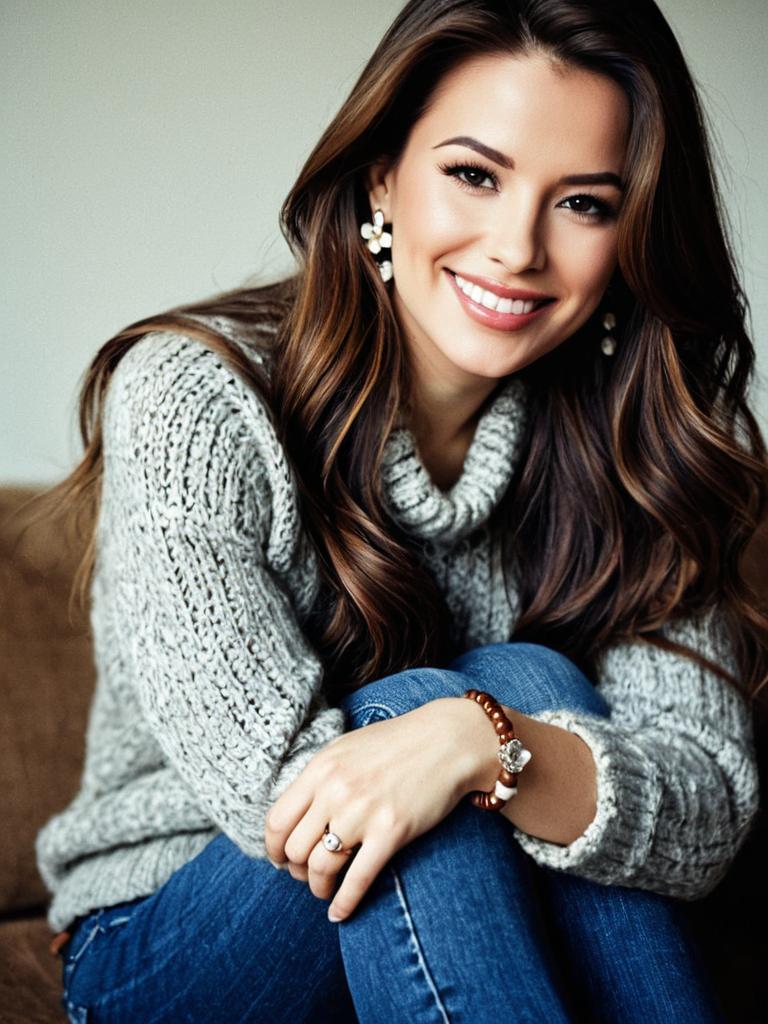 Portrait of a young woman with long brown hair and brown eyes, wearing a light gray chunky knit sweater and blue denim jeans. She is smiling warmly, accessorized with white flower-shaped earrings, a brown beaded bracelet, and a silver ring. The background is softly blurred, emphasizing her joyful expression and casual outfit.