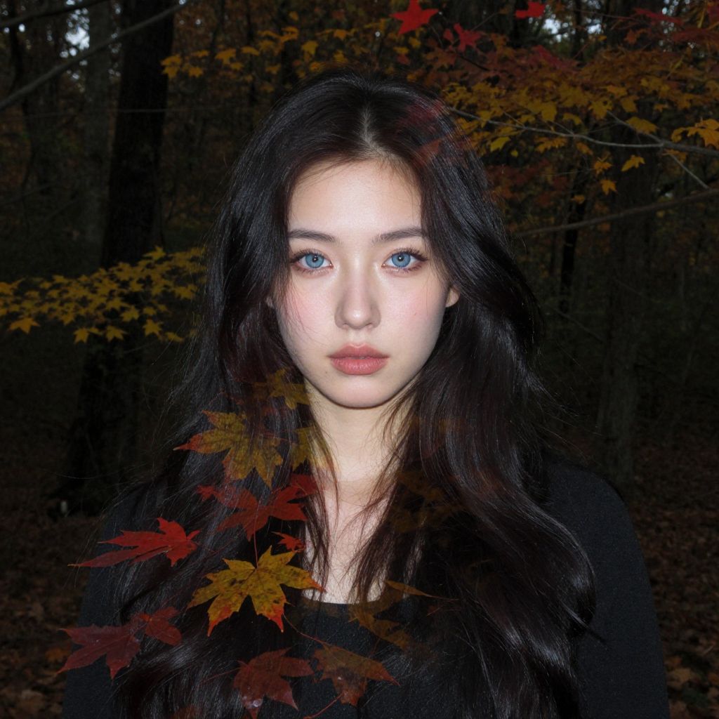 A digital camera captures an enigmatic portrait of a woman with piercing blue eyes amidst a dense, dark forest. Her raven hair flows like shadows, adding to her air of mystery. A transparent overlay of vibrant autumn leaves in red and gold creates a captivating double exposure effect, suggesting tranquility and enchantment. This surreal portrayal showcases the interplay between nature's beauty and human intrigue as she stands stoically, inviting viewers to uncover the untold stories within her gaze.