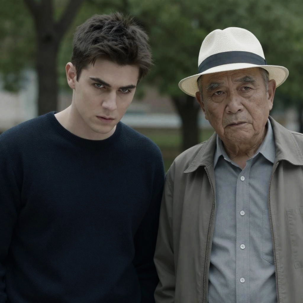 Photograph of two men outdoors. Older man with white hat, dark jacket, and serious expression. Younger man with short brown hair, beige shirt, and smiling. Chain-link fence background. Both seated, facing each other.