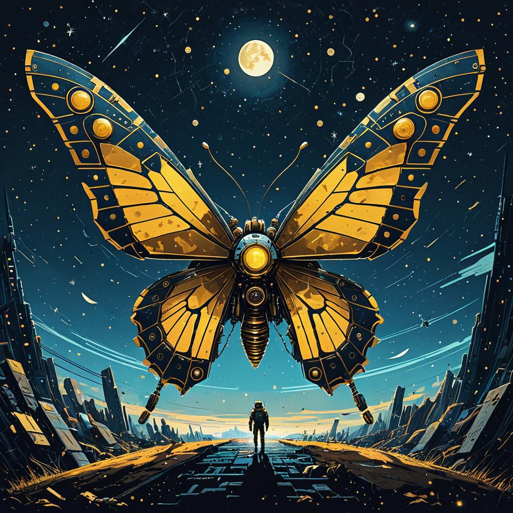 Illustration of a celestial wolf in a forest clearing under a full moon, featuring futuristic and cosmic elements. The artwork is detailed with gold leaf accents forming a decorative frame of leaves around the wolf. The background includes starry sky and silhouetted pine trees, rendered with intense color contrasts in the style of Suzanne Woolcott.