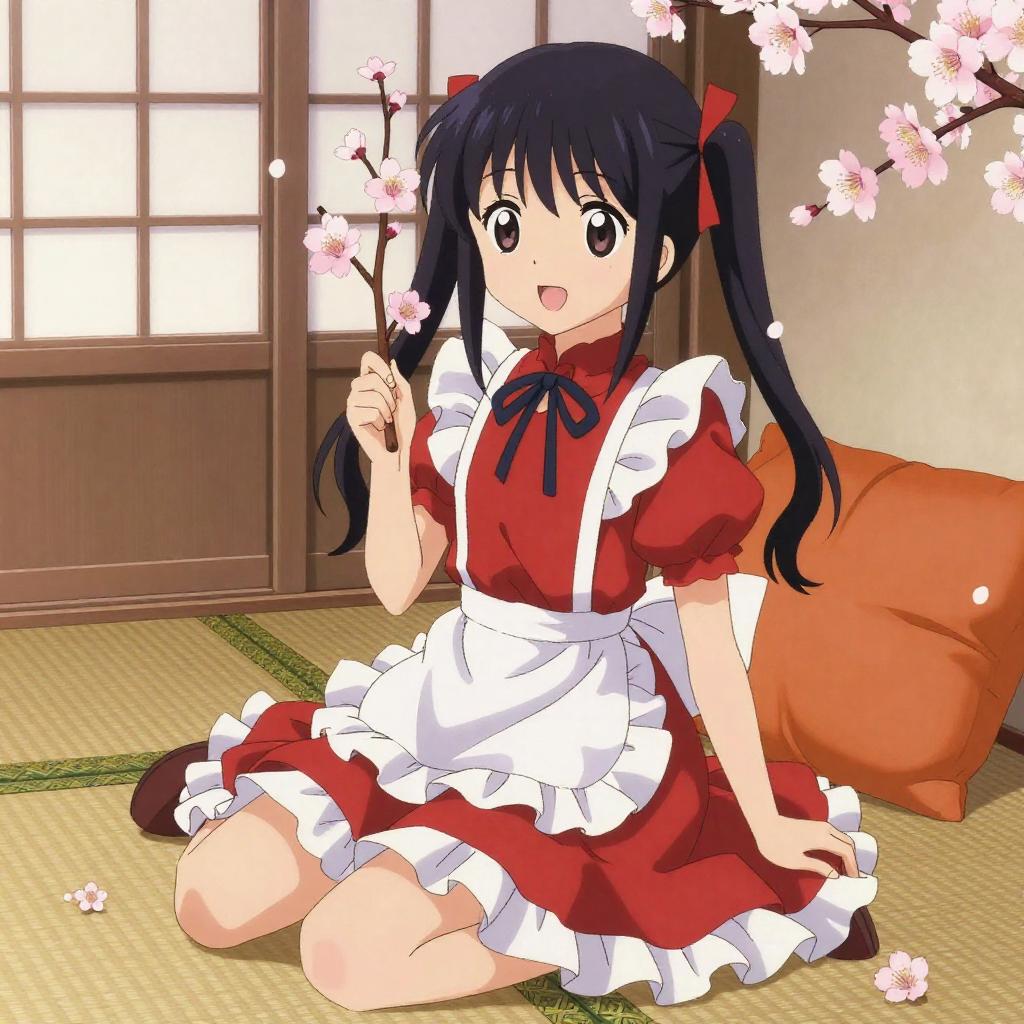 A digital anime-style image of a young girl with black pigtails, wearing a red and white frilled dress, sitting on a tatami mat. She holds a cherry blossom branch, surrounded by pink cherry blossoms and a large orange pillow. The background features a wooden shoji screen.