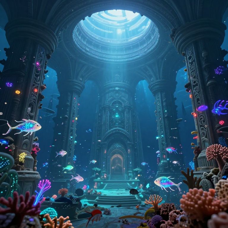 Imagine an enchanting underwater landscape in the style of a futuristic fantasy world, where bioluminescent sea creatures gracefully glide through the depths, illuminating ancient submerged ruins adorned with intricate coral carvings. The camera perspective shifts to reveal these mysterious structures from a unique vantage point, showcasing vibrant marine life thriving amidst the towering pillars and domed ceilings of this sunken city. This captivating image evokes a sense of wonder and discovery, inviting viewers into an ethereal realm where nature's beauty intertwines with the remnants of a long-lost civilization.