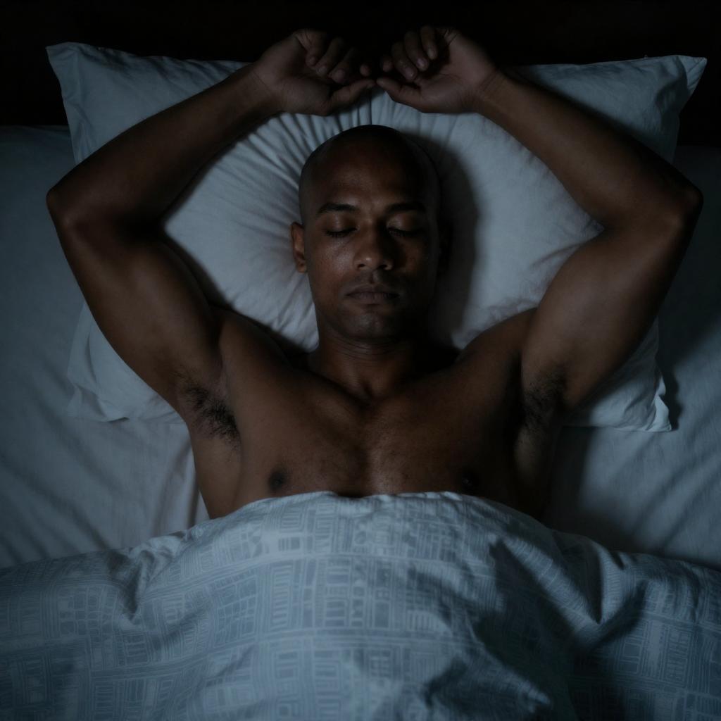 A dimly lit photograph of a muscular, bald man with dark skin lying on a bed, partially covered by a blue-patterned pillow. His arms are raised above his head, and his face is partially obscured by shadows. The background is dark, emphasizing the man's form and the pillow's pattern.