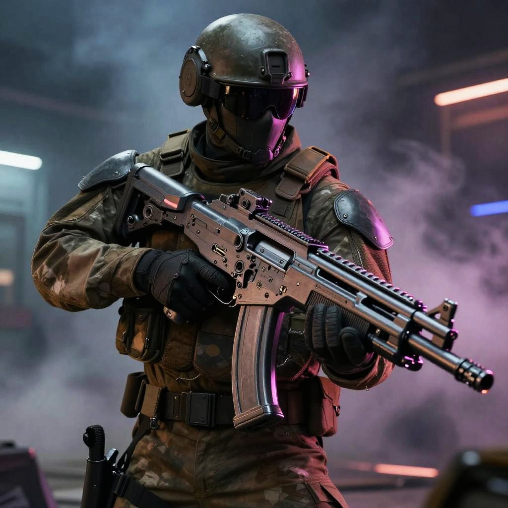 Futuristic machine gun held by a battle-worn soldier, neon lights reflecting off its surface, intricate mechanical parts visible, smoky urban battlefield, cinematic lighting